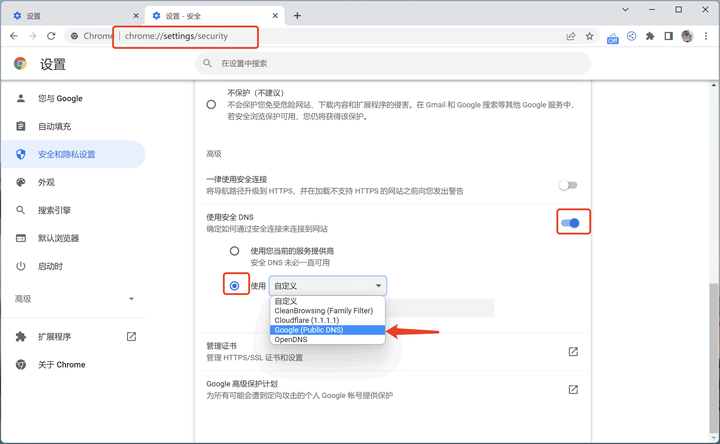 第三步.将 chrome 浏览器的 DNS 地址设置成谷歌提供的官方 DNS 地址。