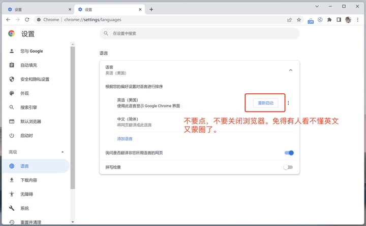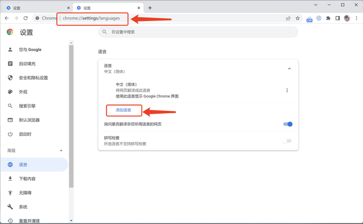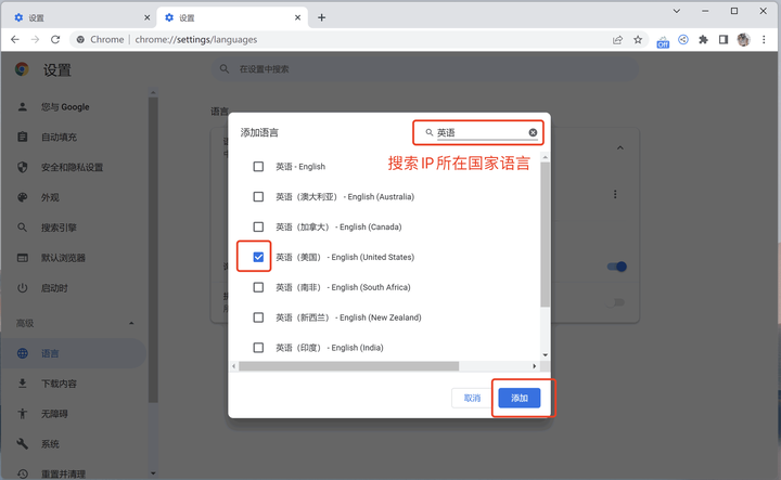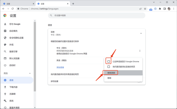 第二步.首先将谷歌 chrome 浏览器的语言设置置顶为 IP 所在国家的语言并勾选以改语言显示 chrome 浏览器。 快捷入口:在浏览器地址输入chrome://settings/languages